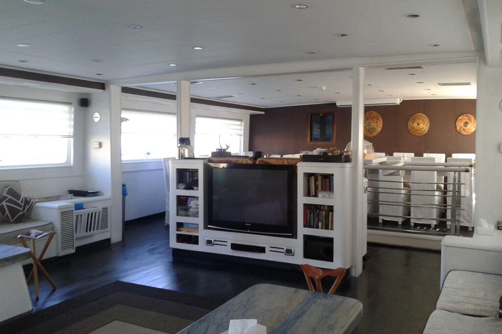 Spazi comunisala da pranzo, bar, Tv, video, Cd Dvd – Esterni Flying bridge con bar e zona prendisole con sdraio. Area divingampio pozzetto con banco ricarica attrezzature fotovideo, sun-deck Bombole12 litri alluminio bi-attacco Din/Int, bombole 6 e 15 litri alluminio mono e bi-attacco Din/Int ( a pagamento ) – Compressori2 Bauer K14 320 lt/min. – Nitrox presente a bordo