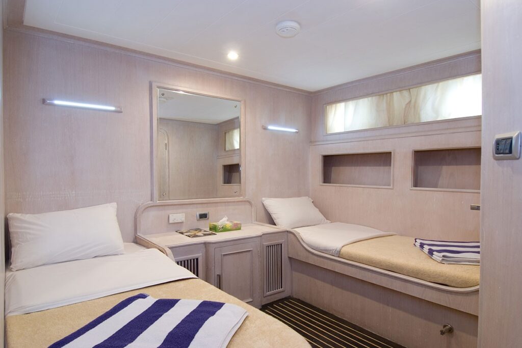Cabine6 doppie, 2 triple tutte con letti separati. 2 suite matrimoniali. Servizi privati e aria condizionata con controlli autonomi in tutte le cabine
